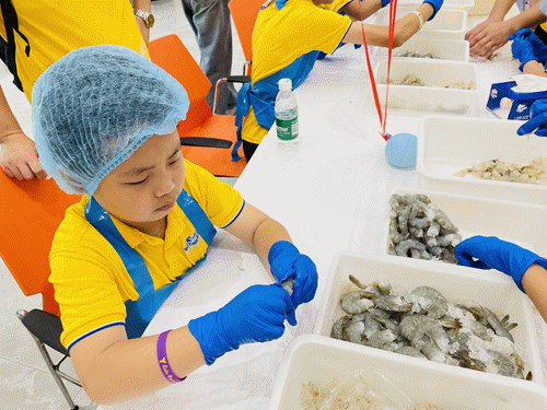 在一番參觀后,迎來了本次活動的重點(diǎn)環(huán)節(jié)——剝蝦微公益課堂,以“小朋友每剝好一條蝦,國聯(lián)水產(chǎn)集團(tuán)便捐出1元”的方式,為大家的愛心買單。